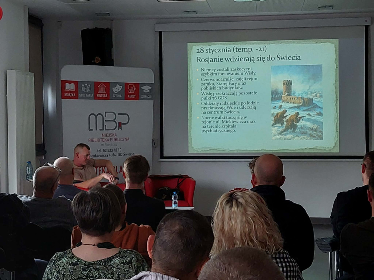 16 kwietnia w Miejskiej Bibliotece Publicznej w ramach Klubu Miłośników Historii KAMUH, odbyło się spotkanie prowadzone przez Dawida Janusa – autora profilu „Powiat Świecki 1939-1945”. Podczas prelekcji pt. „Walki o Świecie zimą 1945 roku w świetle źródeł niemieckich i Armii Czerwonej” przedstawił on przebieg walk toczonych pod Świeciem, zwracając uwagę również na wydarzenia, które rozegrały się poza granicami miasta, a które miały istotne znaczenie dla walk o Świecie. Wydarzenie cieszyło się niemałym zainteresowaniem i oprócz członków klubu pojawiły się też nowe osoby.